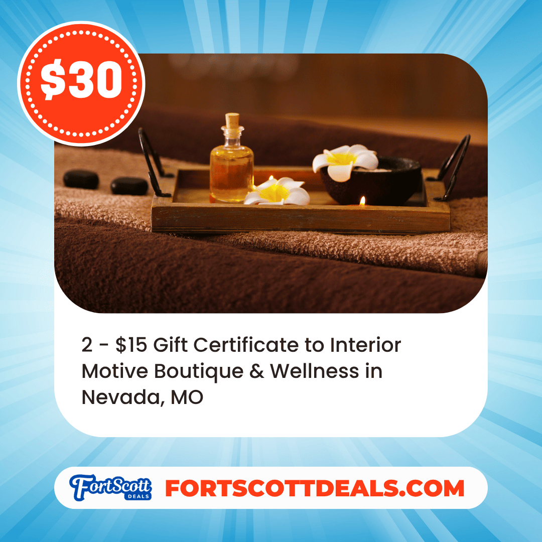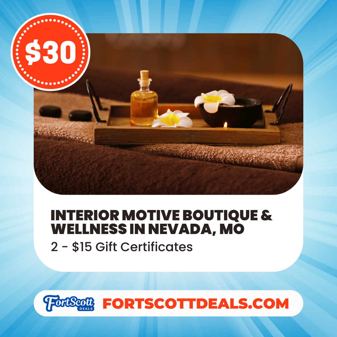 2 - $15 Gift Certificate to Interior Motive Boutique & Wellness in Nevada, MO
